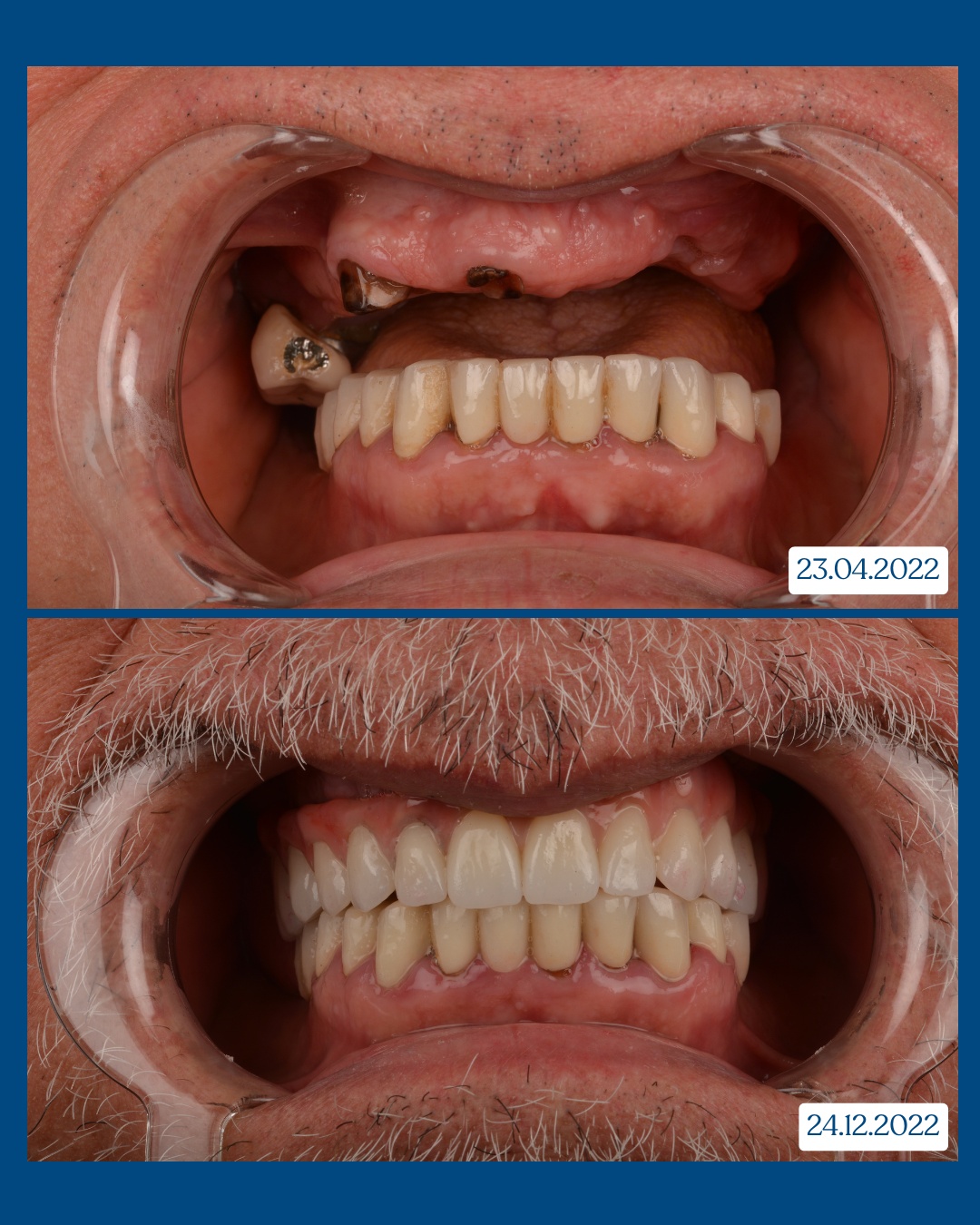 Рехабилитация на горна челюст с 6 импланта Osstem, поддържащи Торонто конструкция (Toronto framework) с циркониеви корони. Това протетично решение цели функционална рехабилитация чрез повишаване на биомеханичната устойчивост и осигуряване на балансирано разпределение на оклузалните сили.